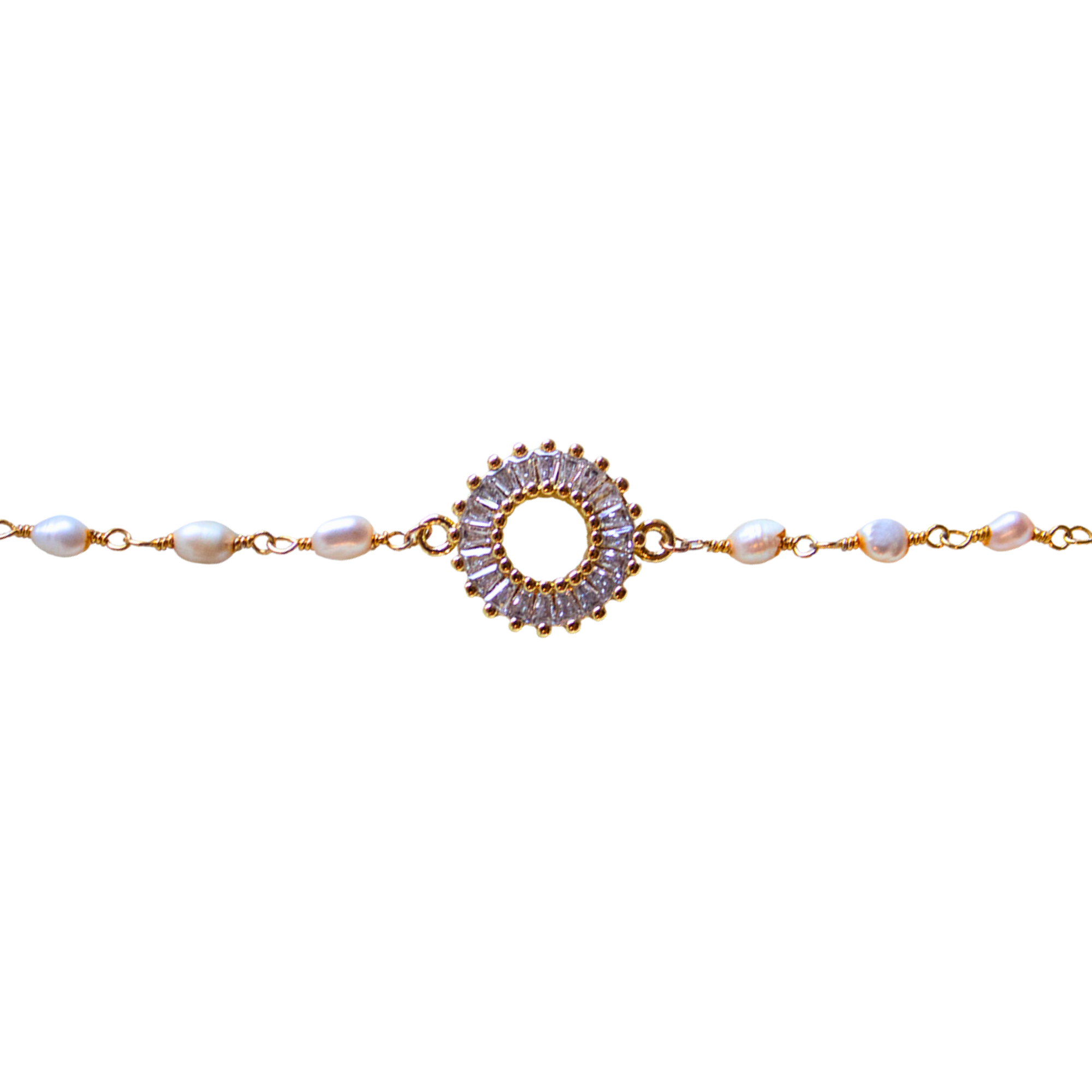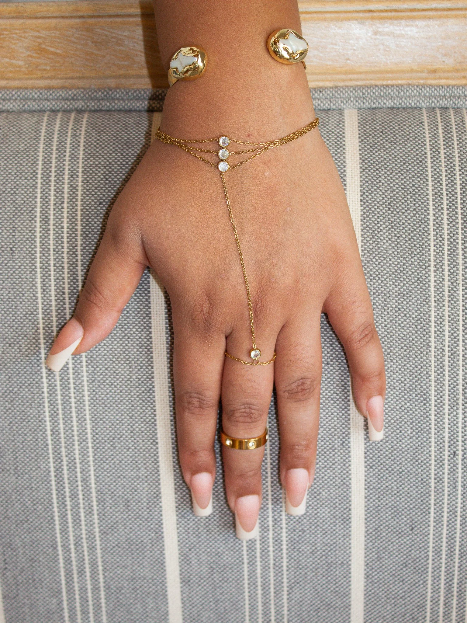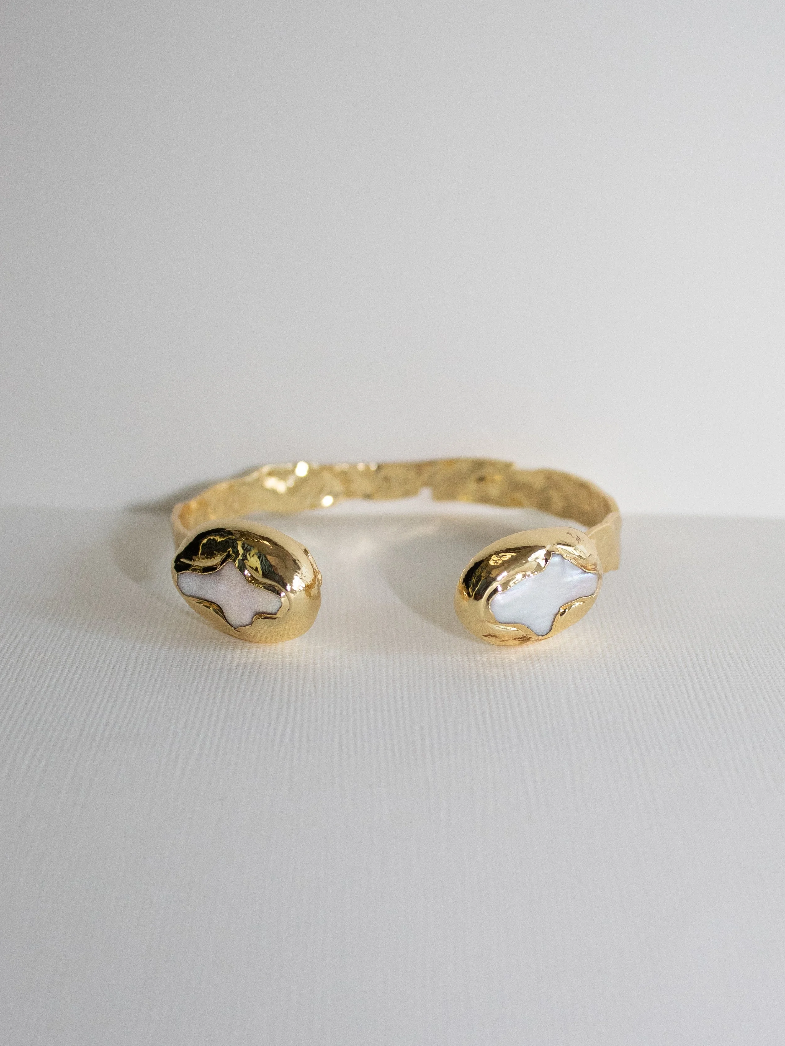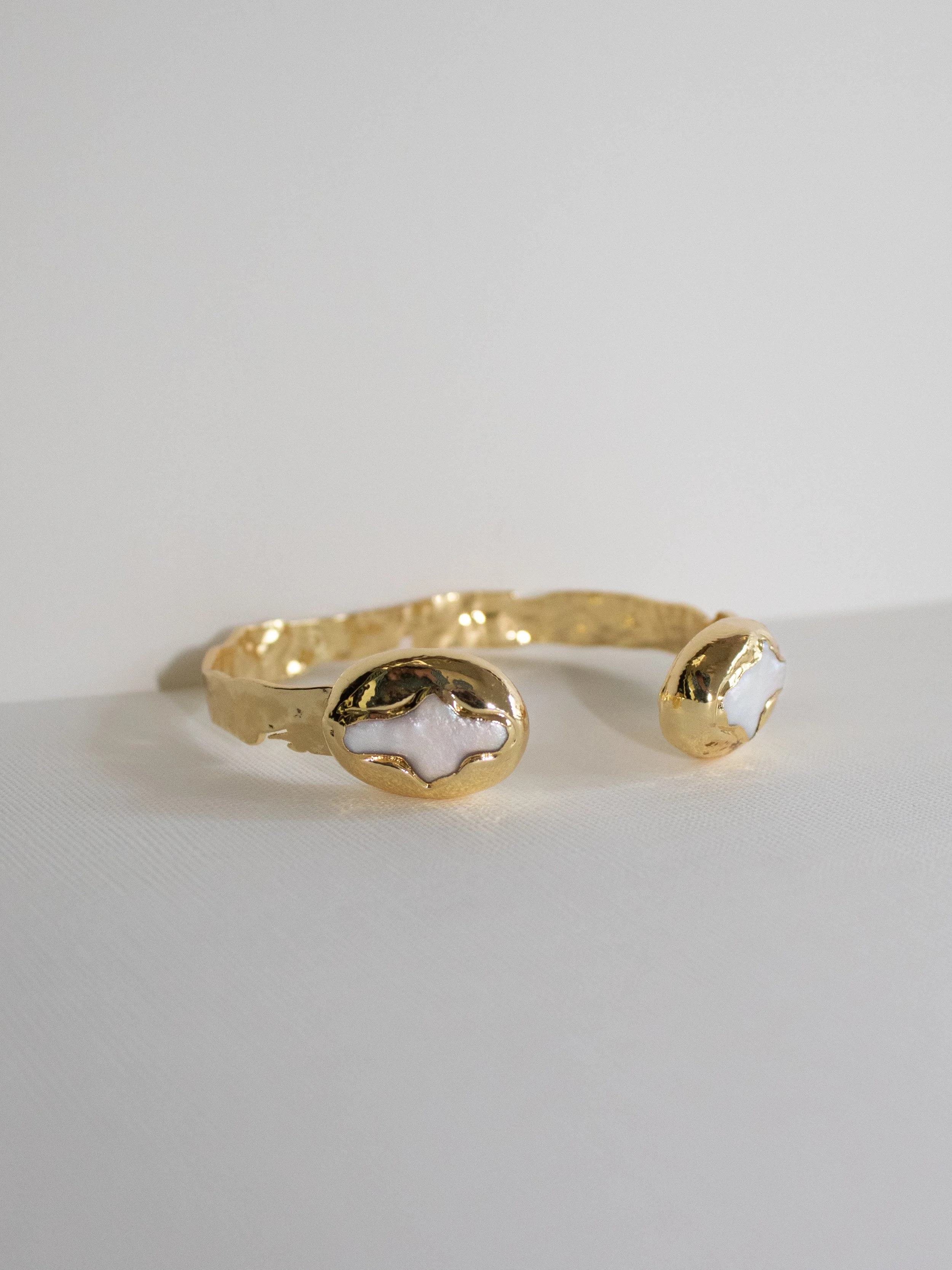 A sleek gold bangle bracelet with inlaid cubic zirconia that radiates classic elegance. Balancing timeless style with modern refinement, it becomes a versatile stackable bangle. Wear solo as an everyday staple or layered with other bracelets for a curated look. The hinge closure ensures an easy, comfortable fit.
